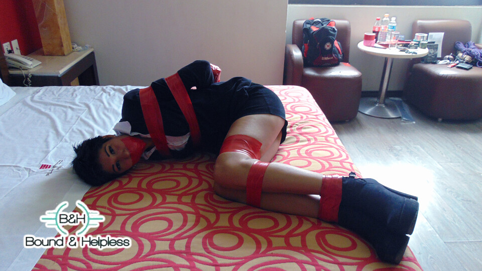 Justine is a business woman who is tied up and gagged with red tape. A pantie in her mouth prevents her from calling for help.
